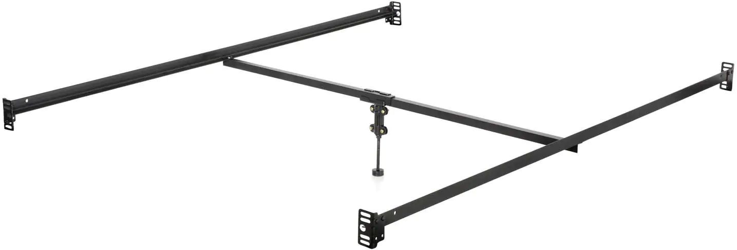 This sturdy metal bed rail system creates a stable foundation for your mattress. Angled steel rails connect to a headboard and footboard via universal bolt-on connections. A center support bar connects to the rails for added stability, with support leg that adjusts in height from 6.5 to 15.5 for a customized fit and a glide foot.