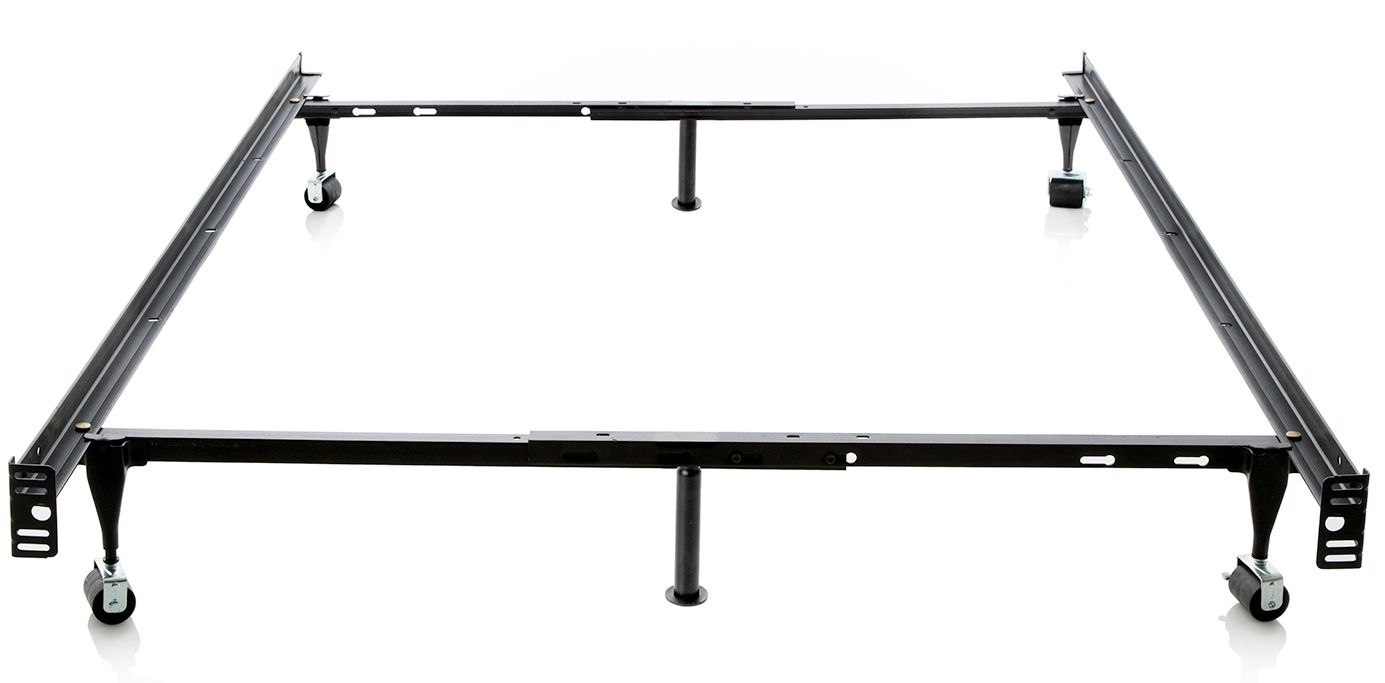 This adjustable bedframe includes multiple support features for added durability. Its primary legs are reinforced with the patented Tri-Support™ system creating optimal frame support. With six locking legs that create triple-thick steel strength and exceptional stability, the frame includes either 2.5" in-line rug rollers or 3" wide glides. Frame width adjusts from 38 inches to 53 inches with a length of 70 inches.
